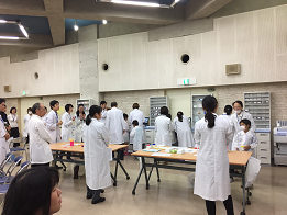 薬剤師会では、薬局の中の設備を本格的に並べて、子供たちは白衣を着て、薬の軽量や袋へ薬を詰め込むという、まさに薬剤師さんが普段やっているお仕事と同じことを体験することができました。